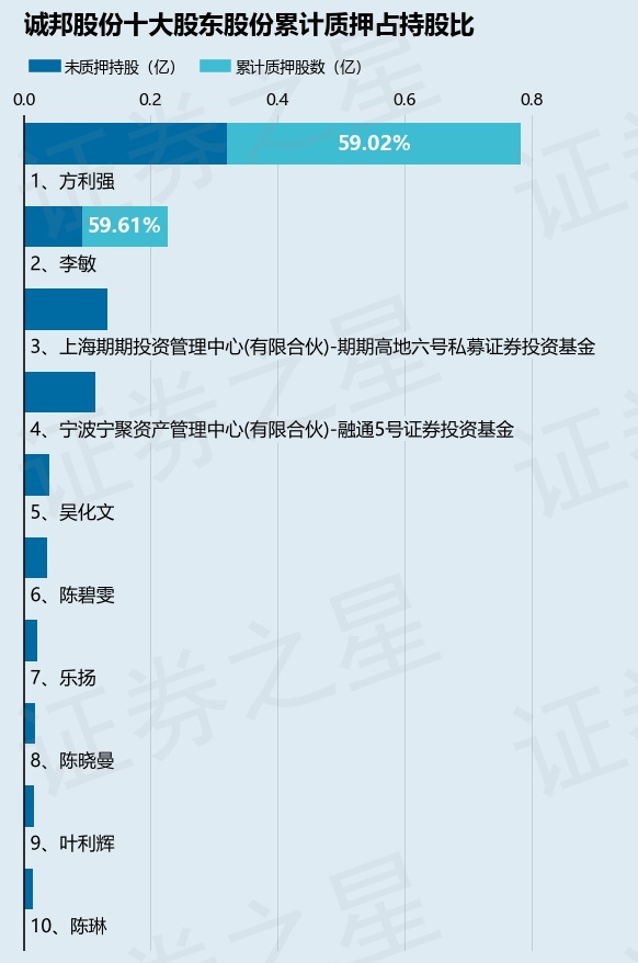 截止本公告日,股东方利强已累计质押股份4620.0万股,占其持股总数的59.02%,股东李敏已累计质押股份1350.0万股,占其持股总数的59.61%。本次质押后诚邦股份十大股东的累计质押股份占持股比例(占持股比例的计算以公司最新一期财务报表公布的十大股东的持股总数为基准)见下图: