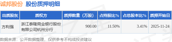证券之星消息,诚邦股份(603316)12月4日公开信息显示,股东方利强向浙江泰隆商业银行股份有限公司杭州分行合计质押900.0万股,占总股本3.41%。质押详情见下表: