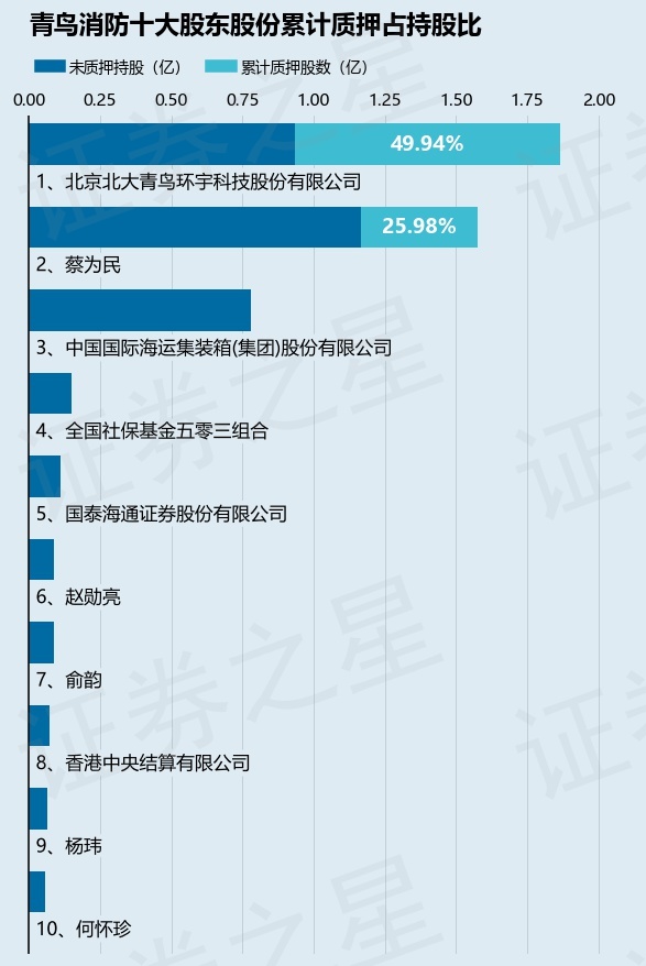 截止本公告日,股东北京北大青鸟环宇科技股份有限公司已累计质押股份9317.0万股,占其持股总数的49.94%,股东蔡为民已累计质押股份4089.83万股,占其持股总数的25.98%。本次质押后青鸟消防十大股东的累计质押股份占持股比例(占持股比例的计算以公司最新一期财务报表公布的十大股东的持股总数为基准)见下图: