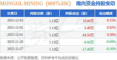 证券之星消息,12月3日南向资金增持16.8万股MONGOL MINING(00975.HK)。近5个交易日中,获南向资金增持的有3天,累计净增持56.7万股。近20个交易日中,获南向资金减持的有11天,累计净减持132.0万股。截至目前,南向资金持有MONGOL MINING(00975.HK)1.13亿股,占公司已发行普通股的10.81%。
