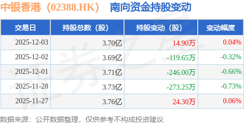 证券之星消息,12月3日南向资金增持14.9万股中银香港(02388.HK)。近5个交易日中,获南向资金减持的有3天,累计净减持599.7万股。近20个交易日中,获南向资金减持的有7天,累计净减持243.65万股。截至目前,南向资金持有中银香港(02388.HK)3.7亿股,占公司已发行普通股的3.48%。