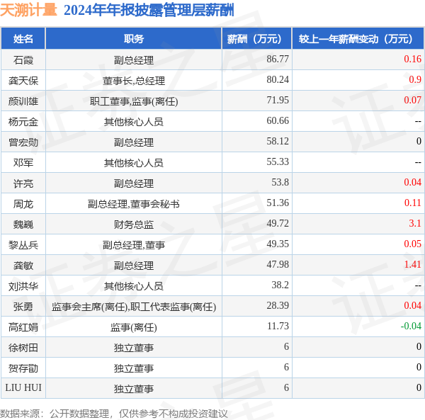 证券之星消息,天溯计量发布2024年年报,数据显示:公司主营收入8.0亿元,同比增10.25%。归母净利润为1.11亿元,同比增9.68%。扣非净利润为1.1亿元,同比增11.31%。当年公司员工总数2463人,同比增4.01%。人均薪酬16.58万元(注:"人均薪酬"根据定期报告中"应付职工薪酬"附注的本期增加值 / 员工总数计算而来),同比增3.86%。人均创收32.49万元,同比增6.0%。人均创利4.51万元,同比增5.45%。其中管理层薪酬总额为761.6万元,同比上一年增5.03%,薪酬最高的为副总经理石霞,薪酬86.77万元。