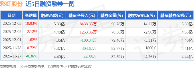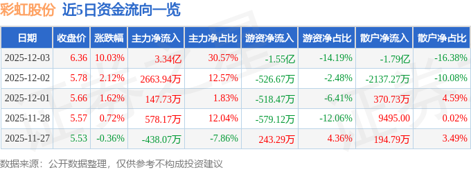 证券之星消息,截至2025年12月3日收盘,彩虹股份(600707)报收于6.36元,上涨10.03%,涨停,换手率4.91%,成交量176.17万手,成交额10.93亿元。
