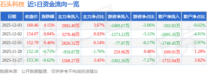 证券之星消息,截至2025年12月3日收盘,石头科技(688169)报收于160.46元,上涨4.15%,换手率1.97%,成交量5.1万手,成交额8.14亿元。