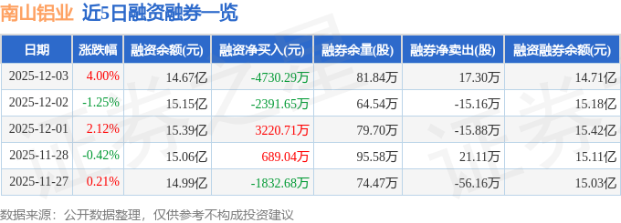 南山铝业融资融券信息显示,融资方面,当日融资买入2.12亿元,融资偿还2.59亿元,融资净偿还4730.29万元。融券方面,融券卖出34.41万股,融券偿还17.11万股,融券余量81.84万股,融券余额404.29万元。融资融券余额14.71亿元。