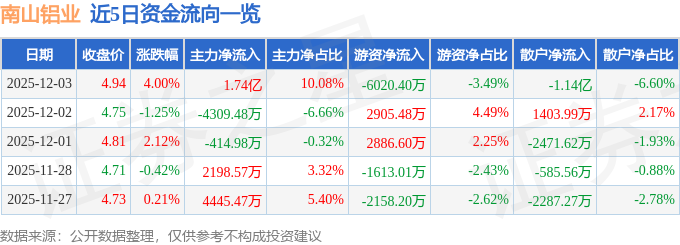 证券之星消息,截至2025年12月3日收盘,南山铝业(600219)报收于4.94元,上涨4.0%,换手率3.03%,成交量352.42万手,成交额17.26亿元。