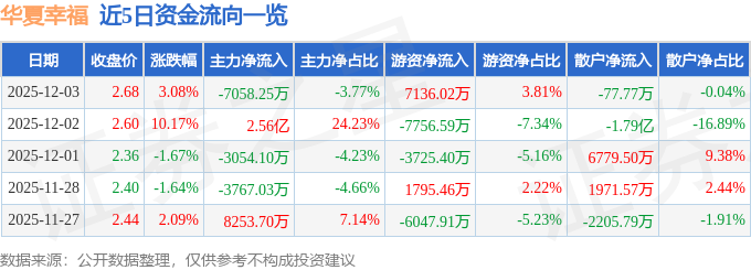 证券之星消息,截至2025年12月3日收盘,华夏幸福(600340)报收于2.68元,上涨3.08%,换手率17.81%,成交量693.44万手,成交额18.72亿元。