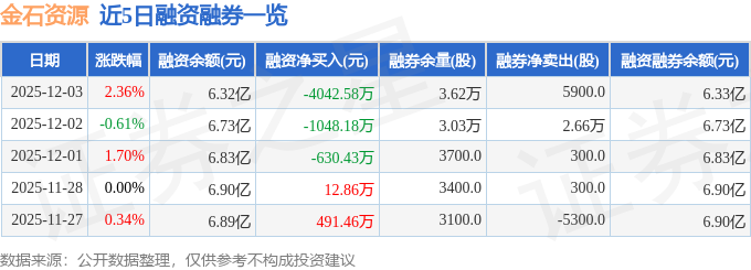 金石资源融资融券信息显示,融资方面,当日融资买入2707.7万元,融资偿还6750.27万元,融资净偿还4042.58万元。融券方面,融券卖出6100.0股,融券偿还200.0股,融券余量3.62万股,融券余额65.99万元。融资融券余额6.33亿元。