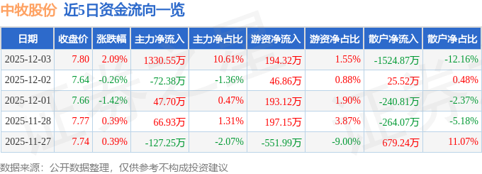 证券之星消息,截至2025年12月3日收盘,中牧股份(600195)报收于7.8元,上涨2.09%,换手率1.58%,成交量16.17万手,成交额1.25亿元。