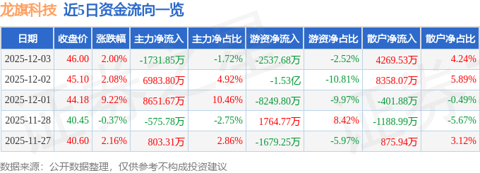 证券之星消息,截至2025年12月3日收盘,龙旗科技(603341)报收于46.0元,上涨2.0%,换手率8.3%,成交量22.09万手,成交额10.07亿元。