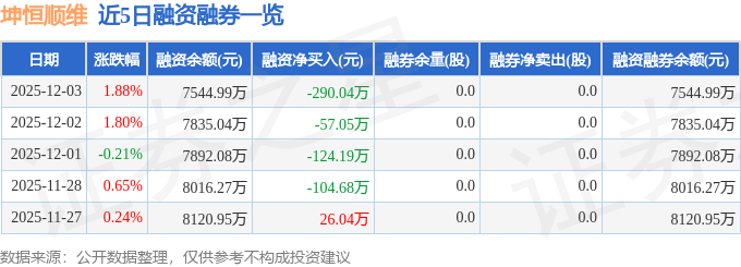 坤恒顺维融资融券信息显示,融资方面,当日融资买入701.32万元,融资偿还991.37万元,融资净偿还290.04万元。融券方面,融券卖出0.0股,融券偿还0.0股,融券余量0.0股,融券余额0.0万元。融资融券余额7544.99万元。