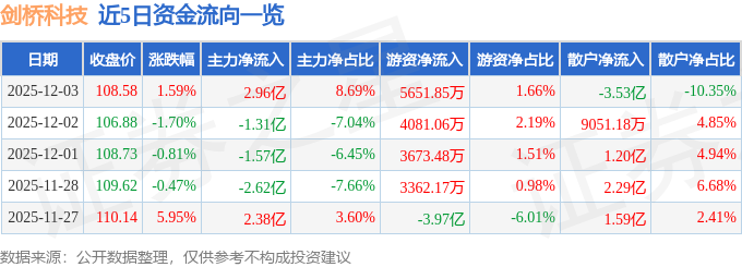 12月3日的资金流向数据方面,主力资金净流入2.96亿元,占总成交额8.69%,游资资金净流入5651.85万元,占总成交额1.66%,散户资金净流出3.53亿元,占总成交额10.35%。