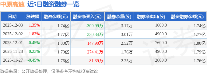 中原高速融资融券信息显示,融资方面,当日融资买入465.82万元,融资偿还775.81万元,融资净偿还309.99万元。融券方面,融券卖出1800.0股,融券偿还200.0股,融券余量3.17万股,融券余额14.33万元。融资融券余额1.74亿元。