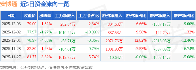 证券之星消息,截至2025年12月3日收盘,安博通(688168)报收于79.0元,上涨1.32%,换手率1.99%,成交量1.53万手,成交额1.21亿元。