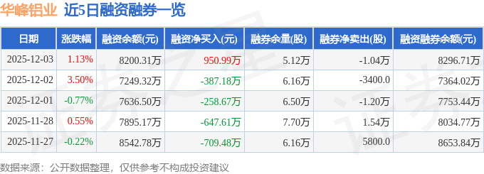 华峰铝业融资融券信息显示,融资方面,当日融资买入3513.94万元,融资偿还2562.96万元,融资净买入950.99万元。融券方面,融券卖出2800.0股,融券偿还1.32万股,融券余量5.12万股,融券余额96.41万元。融资融券余额8296.71万元。