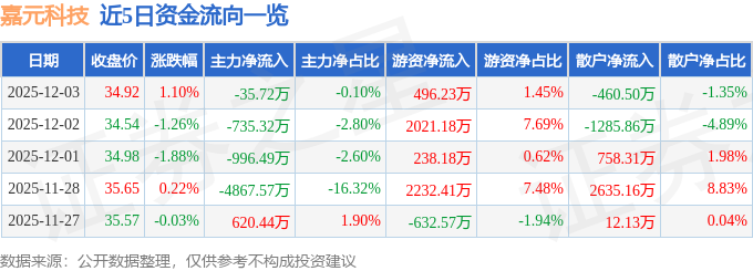 12月3日的资金流向数据方面,主力资金净流出35.72万元,占总成交额0.1%,游资资金净流入496.23万元,占总成交额1.45%,散户资金净流出460.5万元,占总成交额1.35%。