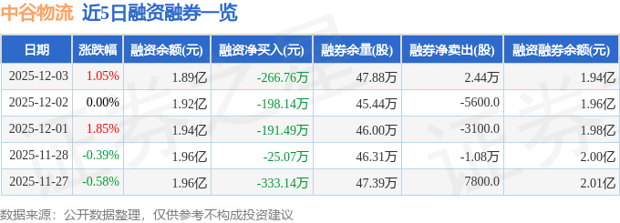 中谷物流融资融券信息显示,融资方面,当日融资买入790.04万元,融资偿还1056.8万元,融资净偿还266.76万元。融券方面,融券卖出2.53万股,融券偿还900.0股,融券余量47.88万股,融券余额505.63万元。融资融券余额1.94亿元。