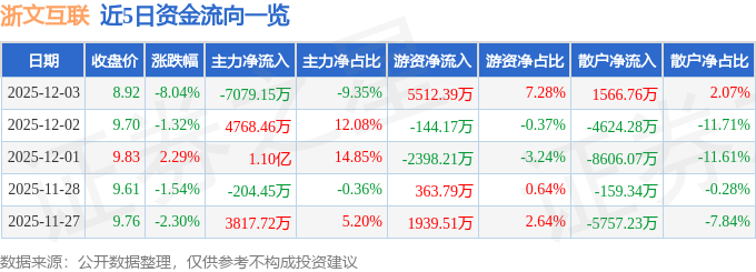证券之星消息,截至2025年12月3日收盘,浙文互联(600986)报收于8.92元,下跌8.04%,换手率5.54%,成交量82.36万手,成交额7.57亿元。