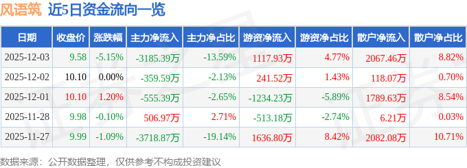 证券之星消息,截至2025年12月3日收盘,风语筑(603466)报收于9.58元,下跌5.15%,换手率4.05%,成交量24.07万手,成交额2.34亿元。