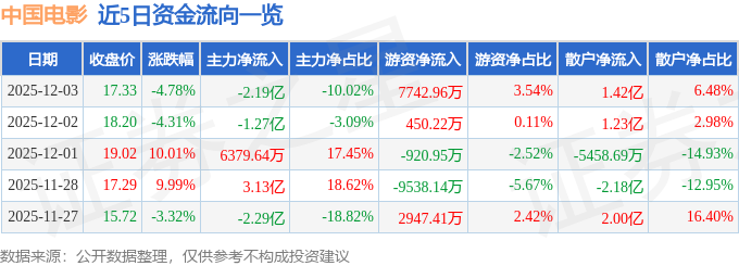 证券之星消息,截至2025年12月3日收盘,中国电影(600977)报收于17.33元,下跌4.78%,换手率6.73%,成交量125.73万手,成交额21.86亿元。