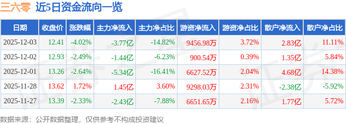 12月3日的资金流向数据方面,主力资金净流出3.77亿元,占总成交额14.82%,游资资金净流入9456.98万元,占总成交额3.72%,散户资金净流入2.83亿元,占总成交额11.11%。