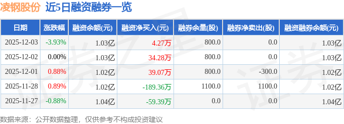 凌钢股份融资融券信息显示,融资方面,当日融资买入233.22万元,融资偿还228.95万元,融资净买入4.27万元,连续3日净买入累计77.63万元。融券方面,融券卖出0.0股,融券偿还0.0股,融券余量800.0股,融券余额0.18万元。融资融券余额1.03亿元。