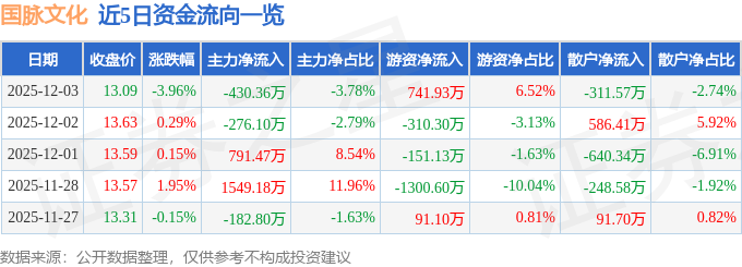 证券之星消息,截至2025年12月3日收盘,国脉文化(600640)报收于13.09元,下跌3.96%,换手率1.08%,成交量8.6万手,成交额1.14亿元。