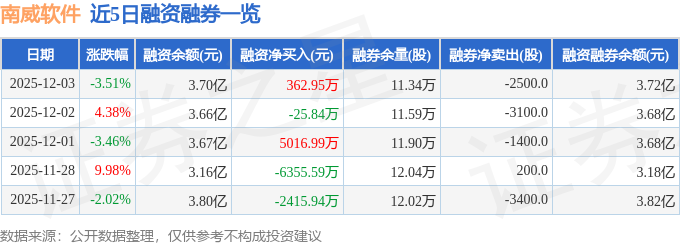 证券之星消息,截至2025年12月3日收盘,南威软件(603636)报收于14.03元,下跌3.51%,换手率11.24%,成交量65.25万手,成交额9.21亿元。