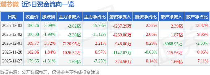 证券之星消息,截至2025年12月3日收盘,瑞芯微(603893)报收于180.26元,下跌3.09%,换手率2.34%,成交量9.84万手,成交额17.9亿元。