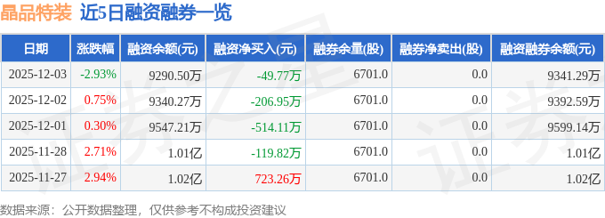 晶品特装融资融券信息显示,融资方面,当日融资买入430.32万元,融资偿还480.08万元,融资净偿还49.77万元。融券方面,融券卖出0.0股,融券偿还0.0股,融券余量6701.0股,融券余额50.79万元。融资融券余额9341.29万元。