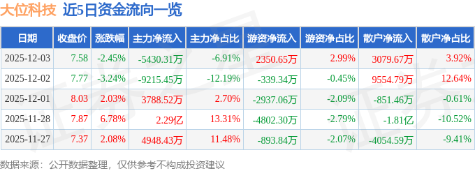 证券之星消息,截至2025年12月3日收盘,大位科技(600589)报收于7.58元,下跌2.45%,换手率7.03%,成交量103.94万手,成交额7.86亿元。