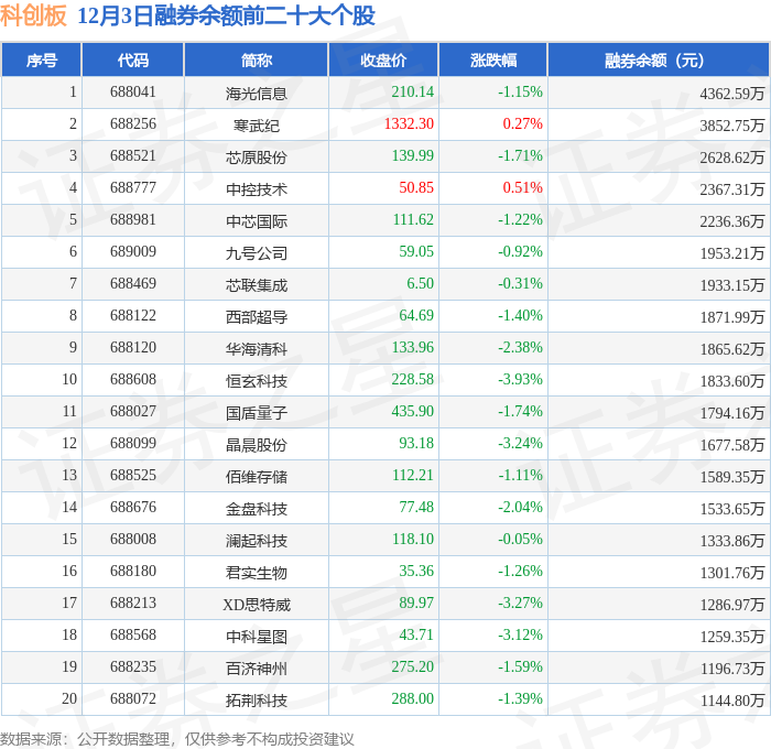 科创板融券余额前三分别为:海光信息(688041)融券余额4362.59万元、寒武纪(688256)融券余额3852.75万元、芯原股份(688521)融券余额2628.62万元,前20具体见下表: