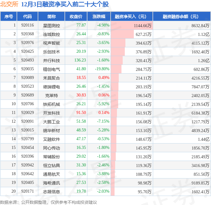北交所融资净买入前三分别为:星图测控(920116)融资净买入1144.66万元、连城数控(920368)融资净买入627.25万元、视声智能(920976)融资净买入394.63万元,前20具体见下表: