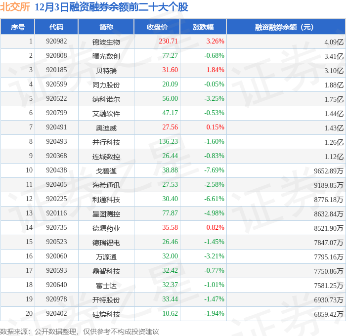 北交所融资融券余额前三分别为:锦波生物(920982)融资融券余额4.09亿元、曙光数创(920808)融资融券余额3.41亿元、贝特瑞(920185)融资融券余额3.1亿元,前20具体见下表:
