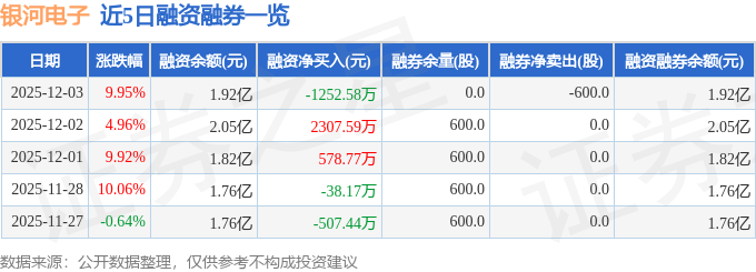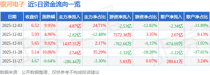 证券之星消息,截至2025年12月3日收盘,银河电子(002519)报收于6.52元,上涨9.95%,涨停,换手率28.41%,成交量317.87万手,成交额19.72亿元。