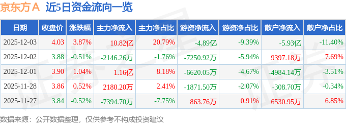 证券之星消息,截至2025年12月3日收盘,京东方A(000725)报收于4.03元,上涨3.87%,换手率3.54%,成交量1300.73万手,成交额52.04亿元。