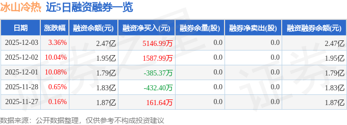 冰山冷热融资融券信息显示,融资方面,当日融资买入1.92亿元,融资偿还1.4亿元,融资净买入5146.99万元。融券方面,融券卖出0.0股,融券偿还0.0股,融券余量0.0股,融券余额0.0万元。融资融券余额2.47亿元。