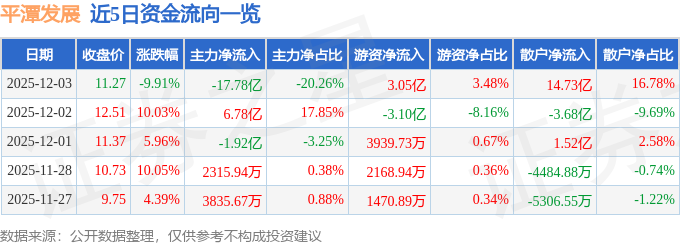 证券之星消息,截至2025年12月3日收盘,平潭发展(000592)报收于11.27元,下跌9.91%,换手率37.51%,成交量718.37万手,成交额87.76亿元。