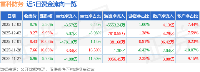 证券之星消息,截至2025年12月3日收盘,雷科防务(002413)报收于8.76元,下跌5.5%,换手率47.08%,成交量608.76万手,成交额55.49亿元。