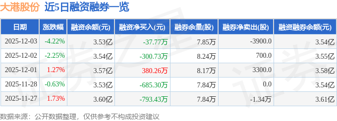 大港股份融资融券信息显示,融资方面,当日融资买入2805.95万元,融资偿还2843.71万元,融资净偿还37.77万元。融券方面,融券卖出0.0股,融券偿还3900.0股,融券余量7.85万股,融券余额117.59万元。融资融券余额3.54亿元。