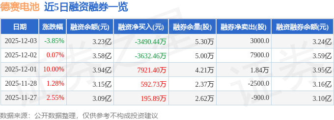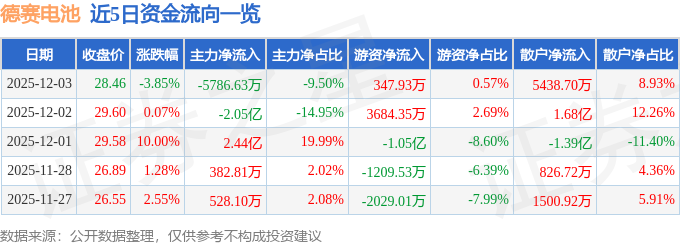 证券之星消息,截至2025年12月3日收盘,德赛电池(000049)报收于28.46元,下跌3.85%,换手率5.51%,成交量21.19万手,成交额6.09亿元。