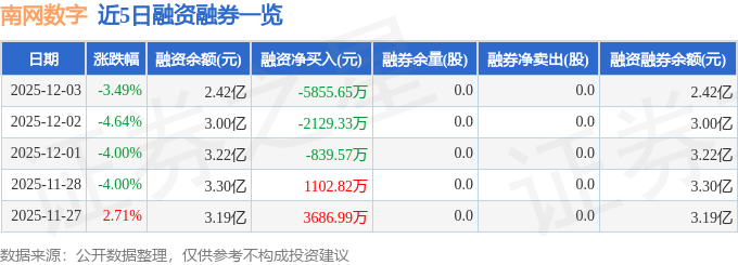 南网数字融资融券信息显示,融资方面,当日融资买入1.26亿元,融资偿还1.85亿元,融资净偿还5855.65万元。融券方面,融券卖出0.0股,融券偿还0.0股,融券余量0.0股,融券余额0.0万元。融资融券余额2.42亿元。