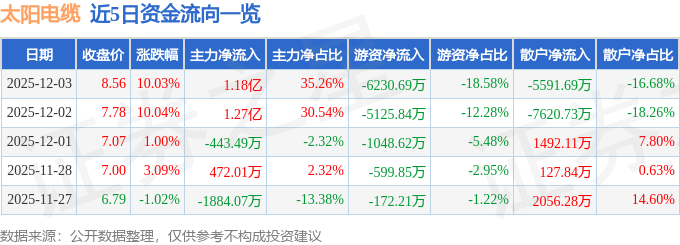 证券之星消息,截至2025年12月3日收盘,太阳电缆(002300)报收于8.56元,上涨10.03%,已连续涨停2天,换手率5.46%,成交量39.46万手,成交额3.35亿元。