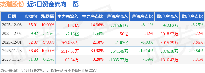 证券之星消息,截至2025年12月3日收盘,杰瑞股份(002353)报收于65.91元,上涨10.0%,涨停,换手率2.09%,成交量14.51万手,成交额9.51亿元。