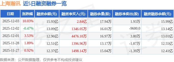 上海瀚讯融资融券信息显示,融资方面,当日融资买入8.1亿元,融资偿还5.26亿元,融资净买入2.84亿元,净买入额两市排名第5,连续3日净买入累计3.42亿元。融券方面,融券卖出2.09万股,融券偿还1600.0股,融券余量17.94万股,融券余额547.17万元。融资融券余额15.99亿元。
