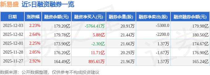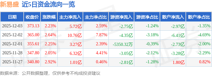 证券之星消息,截至2025年12月3日收盘,新易盛(300502)报收于373.13元,上涨2.23%,换手率6.55%,成交量58.03万手,成交额221.02亿元。