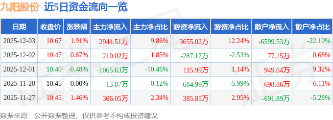 证券之星消息,截至2025年12月3日收盘,九阳股份(002242)报收于10.67元,上涨1.91%,换手率3.66%,成交量27.9万手,成交额2.99亿元。