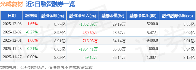 光威复材融资融券信息显示,融资方面,当日融资买入6059.05万元,融资偿还7911.93万元,融资净偿还1852.89万元。融券方面,融券卖出5300.0股,融券偿还100.0股,融券余量29.19万股,融券余额864.2万元。融资融券余额8.85亿元。