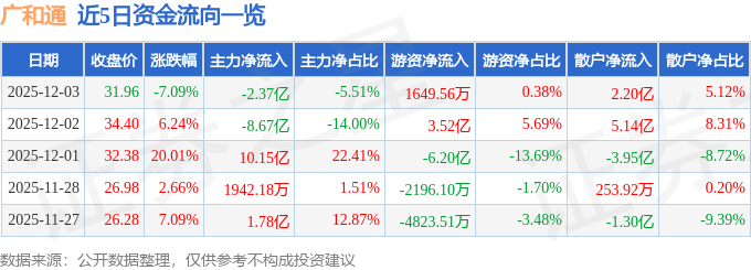 证券之星消息,截至2025年12月3日收盘,广和通(300638)报收于31.96元,下跌7.09%,换手率24.63%,成交量131.24万手,成交额42.95亿元。