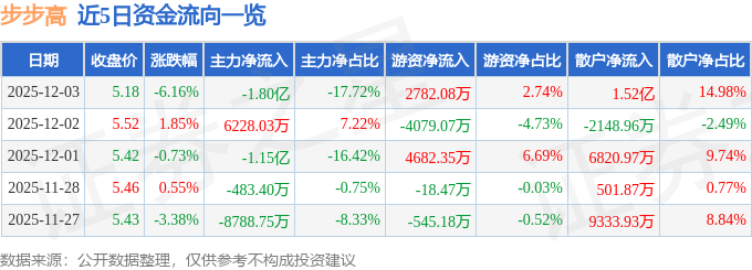 证券之星消息,截至2025年12月3日收盘,步步高(002251)报收于5.18元,下跌6.16%,换手率8.99%,成交量193.42万手,成交额10.16亿元。